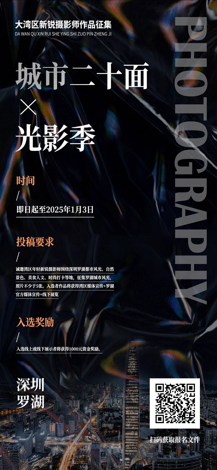 粵港澳大灣區(qū)各地新銳攝影師,廣大攝影家、攝影工作者、攝影愛好者均可投稿,每位交片不少于5張;擇優(yōu)15位攝影師作品入選,屆時將獲得灣區(qū)媒體宣傳曝光+羅湖官方媒體宣傳+線下展覽(鼓勵大家多投不同角度作品,單張優(yōu)秀作品可另議)。