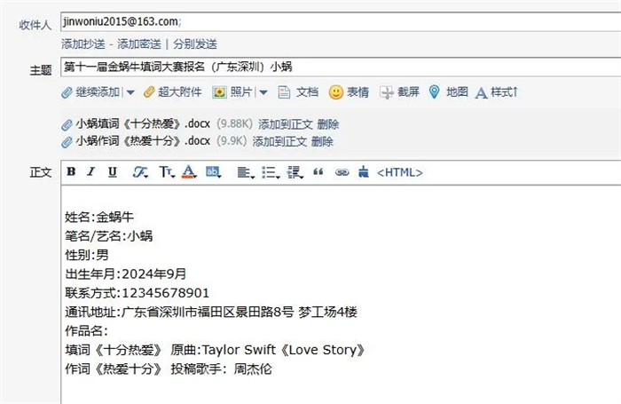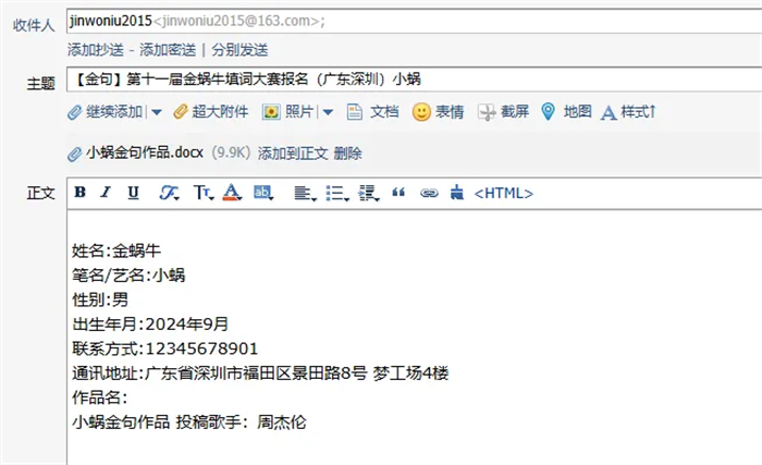 ② 郵件正文:請將姓名、筆名/藝名(無則不填)、性別、出生年月、聯(lián)系方式、通訊地址與作品名(填詞、作詞作品名)等個人信息,按照以上順序依次填寫至郵箱正文。