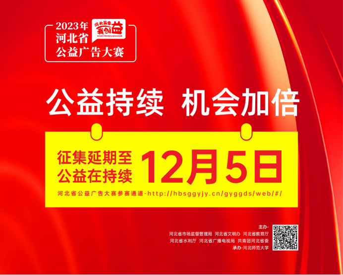 2023年河北省公益廣告大賽自舉辦以來(lái)受到社會(huì)廣泛支持與參與,綜合考慮社會(huì)公眾的參賽積極性,應(yīng)廣大參賽者建議與要求,為提供更加充裕的公益創(chuàng)作時(shí)間,經(jīng)大賽研究決定,特將作品征集截止時(shí)間由2023年11月20日延至12月5日,歡迎熱愛(ài)公益的社會(huì)各界人士踴躍參與!